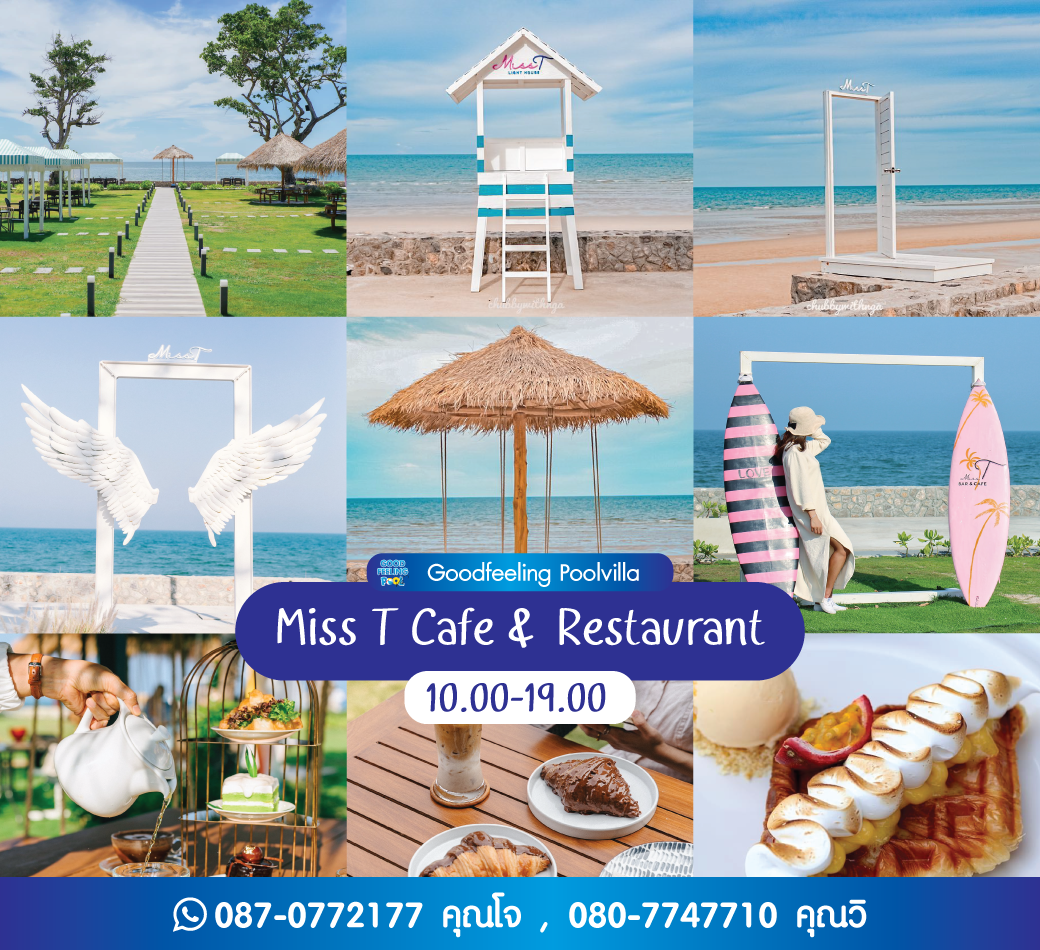 7.Miss T Cafe & Restaurant (มิสที คาเฟ่ แอนด์ เรสเตอร์รอง) คาเฟ่หัวหิน-ชะอำ บรรยากาศร้านเน้นความสบายๆ ไม่ว่าจะเป็นโซน Indoor แอร์เย็นฉ่ำ ที่มาพร้อมบรรยากาศเรือนกระจกสไตล์โมเดิร์น ที่สามารถมองเห็นวิวทะเลได้แบบพาโนรามา หรืออยากนั่งเล่นรับลม ก็นั่งด้านนอก โซนริมทะเล ที่มาพร้อมโต๊ะเก้าอี้และหลังคานั่งสบาย และที่สำคัญยังมีโซนริมหาดที่มาพร้อมเบาะนั่งบีนแบ็กไว้ให้นั่งชิล แถมมุมถ่ายรูปทั้งริมหาดและในร้านบอกเลย...เพียบ!!! ใครที่รู้ตัวว่าชอบถ่ายรูป ไม่ควรพลาด.. นะจ๊ะ!