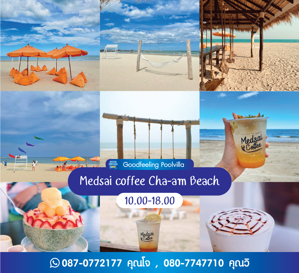 1.Medsai coffee Cha-am Beach (เม็ดทรายคอฟฟี่) คาเฟ่หัวหิน-ชะอำ คาเฟ่บรรยากาศ..ทะเล ทะเล ทะเล.. การตกแต่งให้อารมณ์เหมือนเรากำลัง เดินอยู่ริมชายหาดทะเลแคริบเบียน! ไม่ว่าจะ เป็นบ้านไม้ ชิงช้า บีนแบ็ก บลาๆ ตกแต่งได้อย่างลงตัว เรียกได้ว่า ใครชอบถ่ายภาพกับบรรยากาศ ริมทะเล..มีแอคท่าถ่ายรูปกันจนเมื่อยล่ะ!! ส่วนใครที่ร้อนจากแดดอันแรงกล้าของเมืองไทยจนไม่ ไหวกับการนั่งริมทะเล ที่นี่ก็มีห้องแอร์เล็กๆ ไว้ให้บริการอีกด้วย